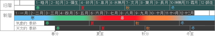 * 対応が明確であるがゆえに、「春の初め」といえば必ず一月であり、「夏の終わり」といえば必ず六月である。